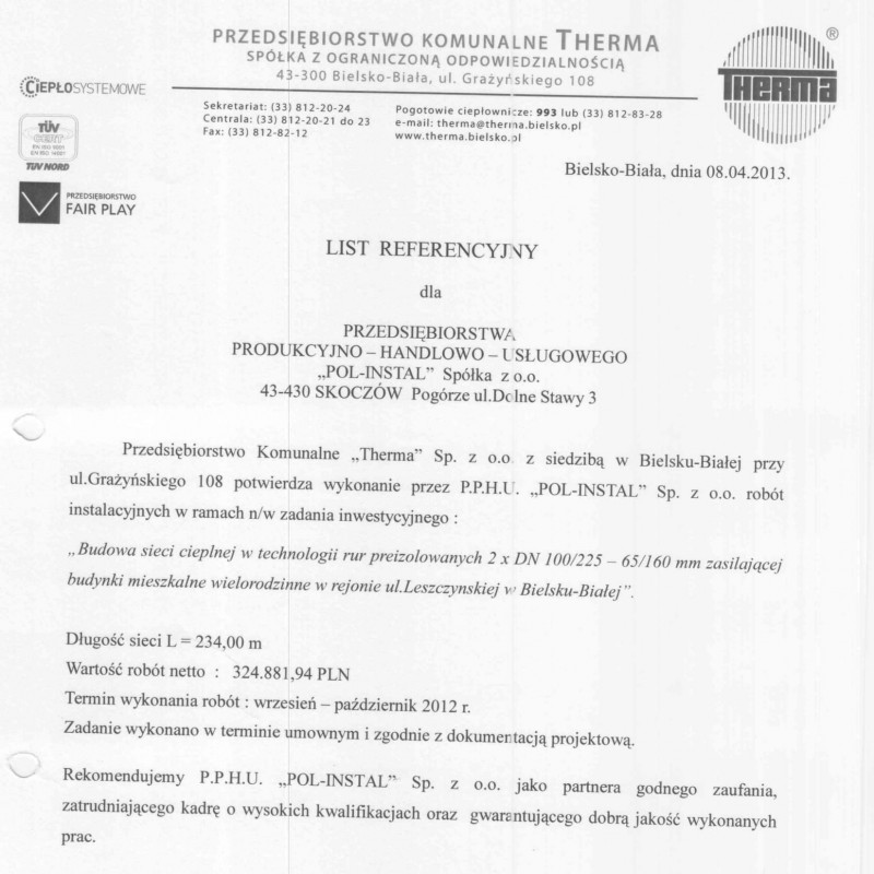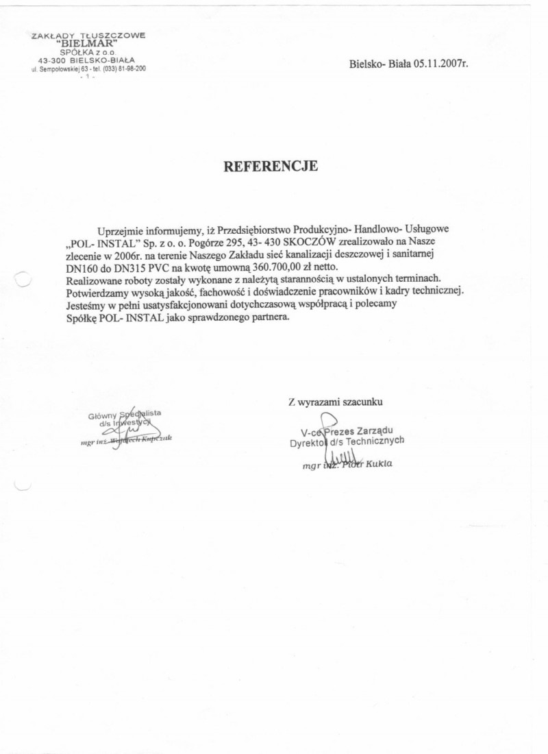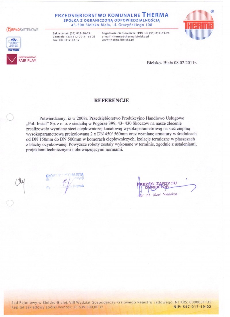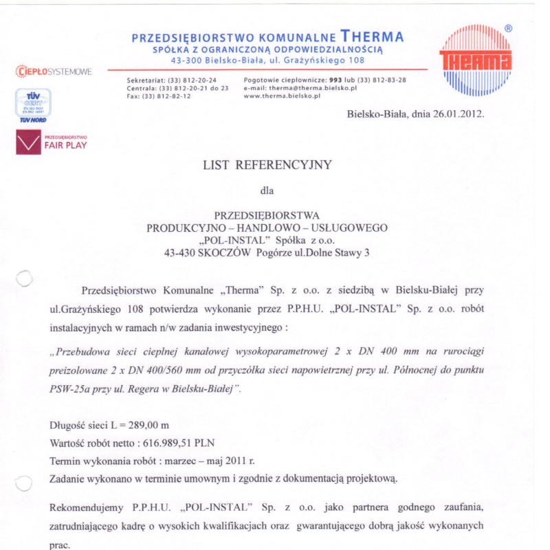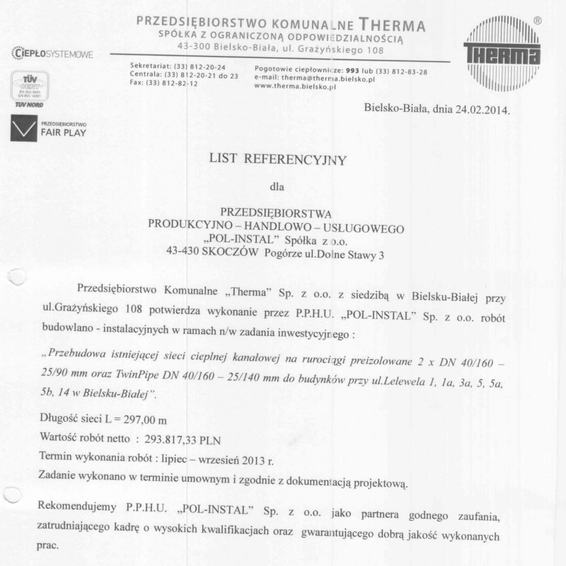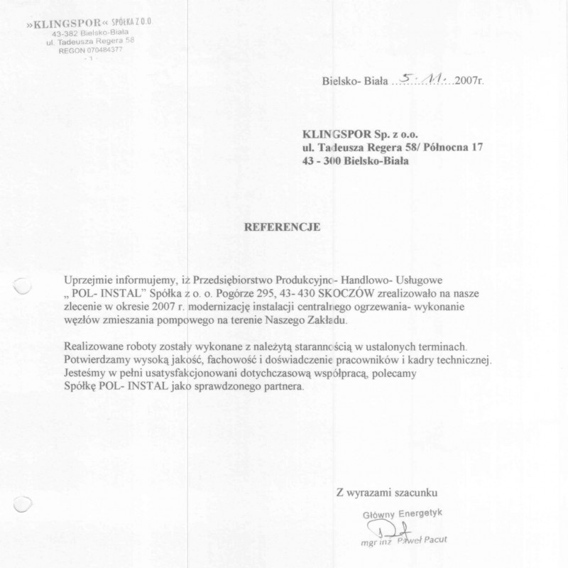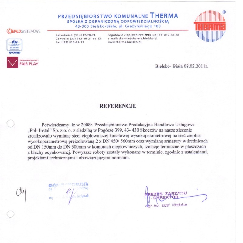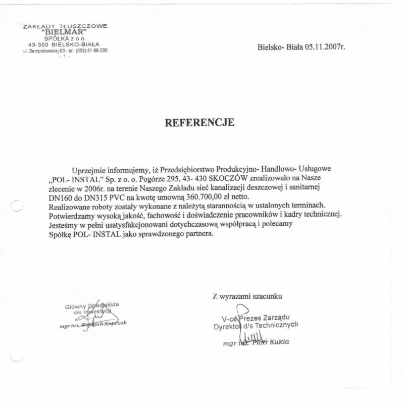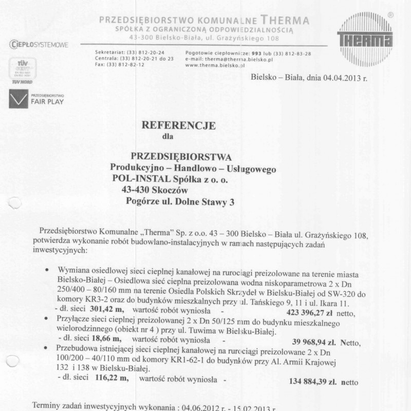 Posiadamy referencje, które obrazują zakres naszej działalności, zarówno w przemyśle, jak i budownictwie użyteczności publicznej, a także w gospodarce komunalnej – sieci ciepłowniczych, gazowych, wodociągowych, kanalizacyjnych.