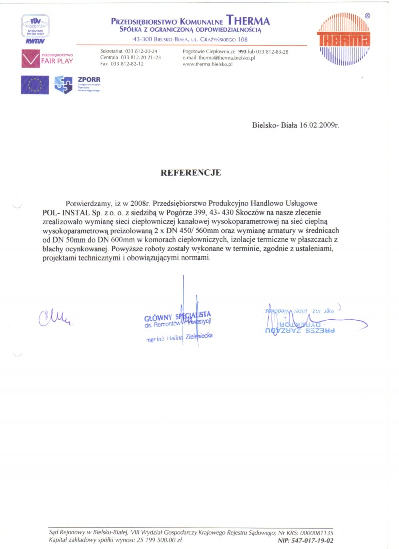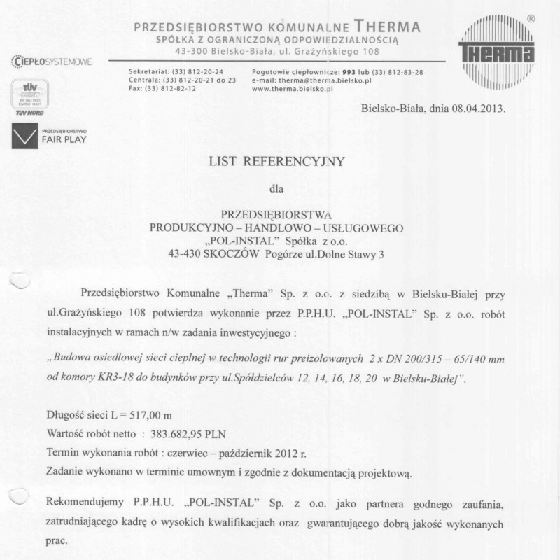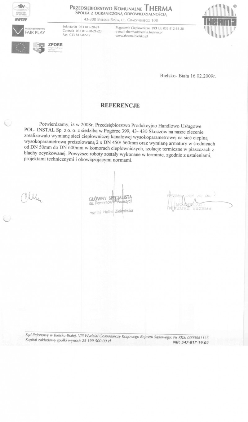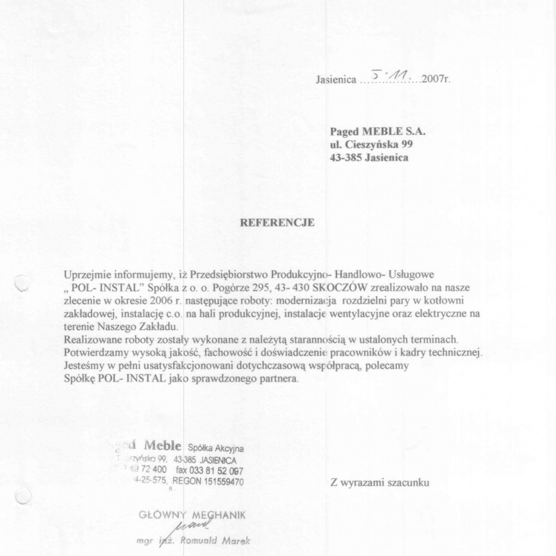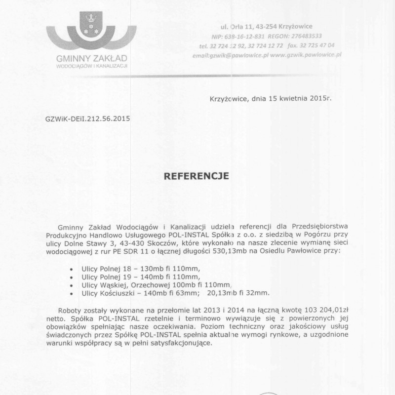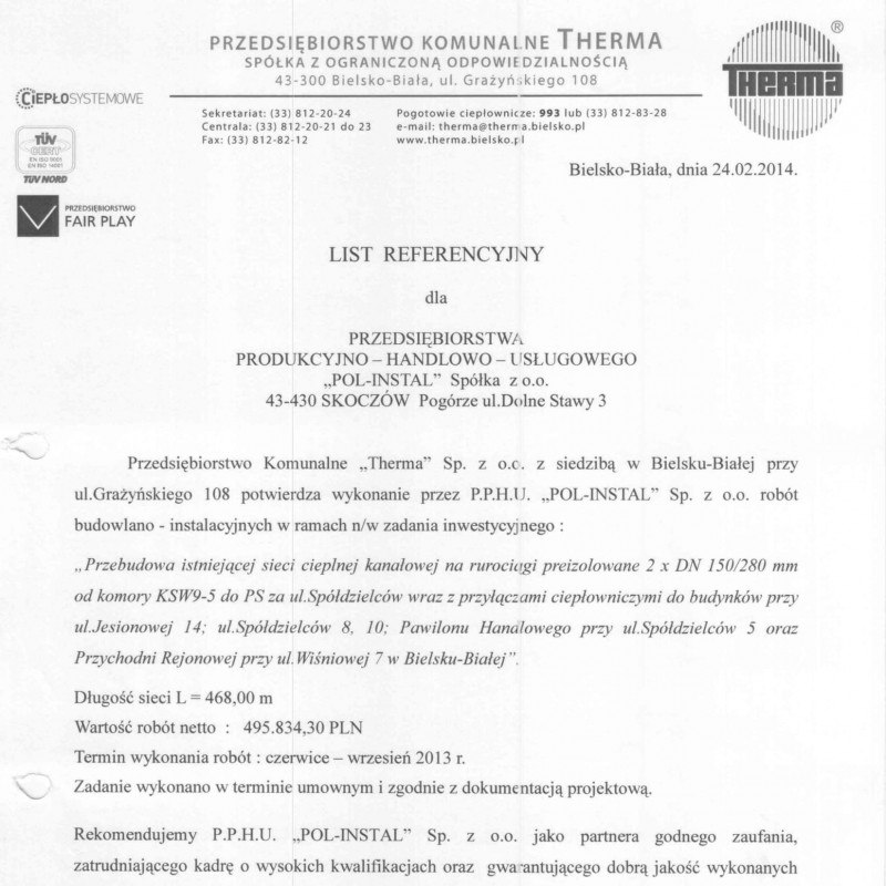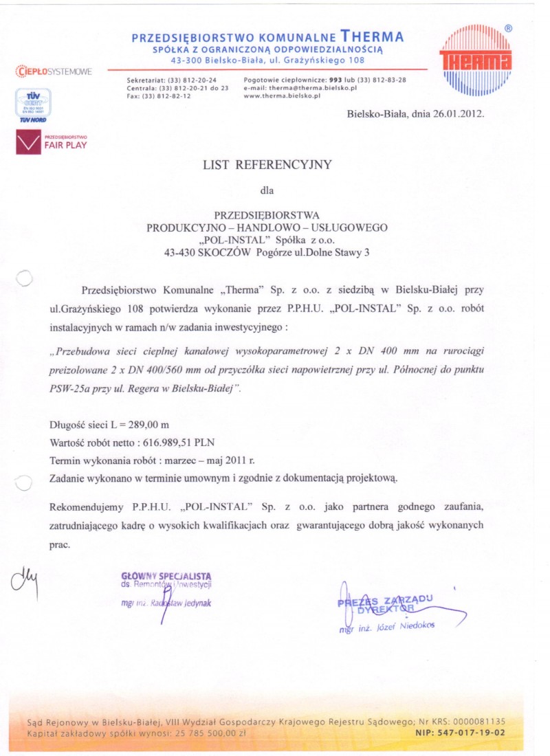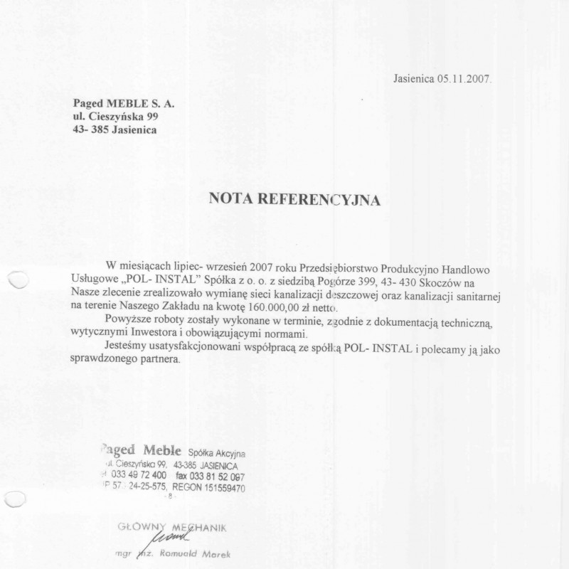 Posiadamy referencje, które obrazują zakres naszej działalności, zarówno w przemyśle, jak i budownictwie użyteczności publicznej, a także w gospodarce komunalnej – sieci ciepłowniczych, gazowych, wodociągowych, kanalizacyjnych.