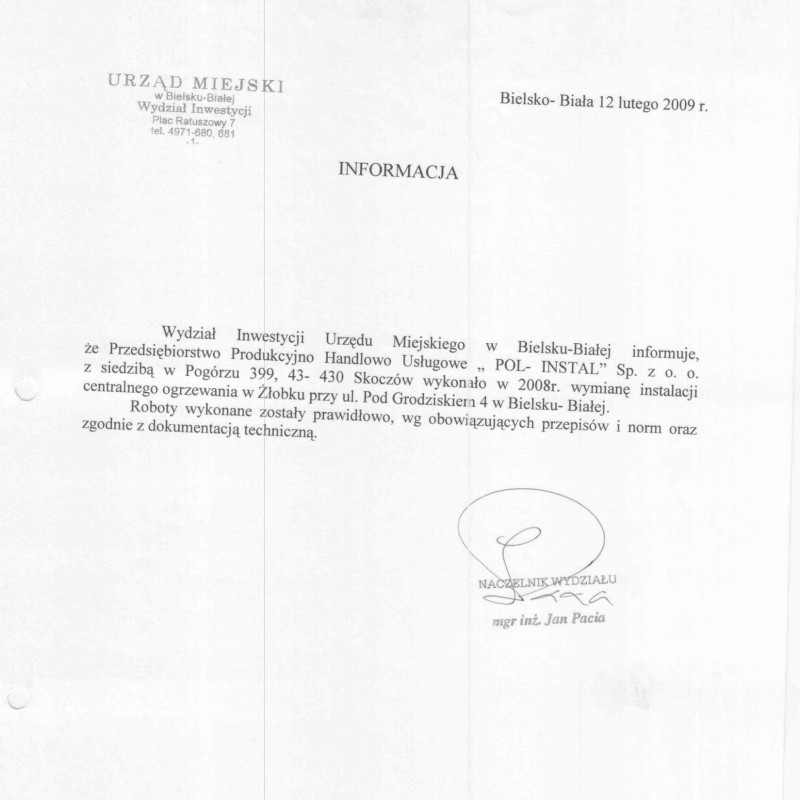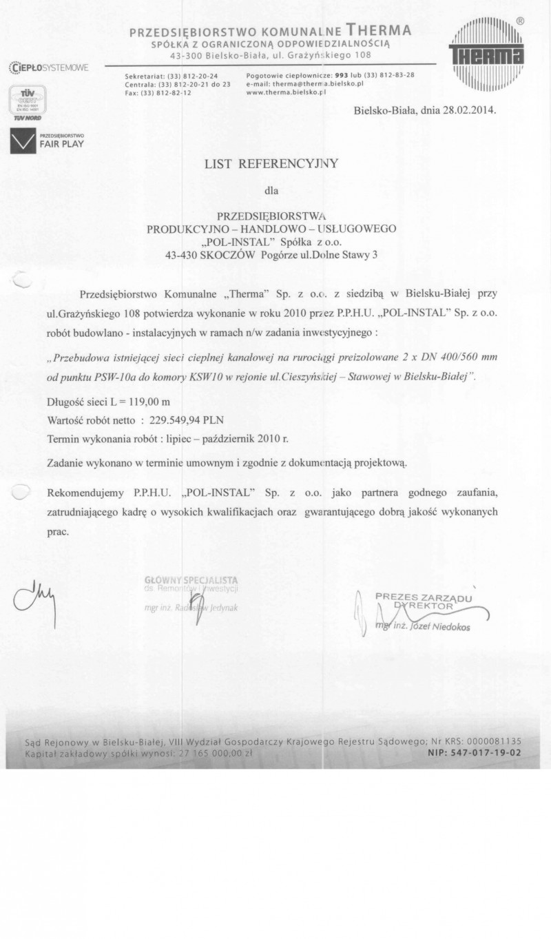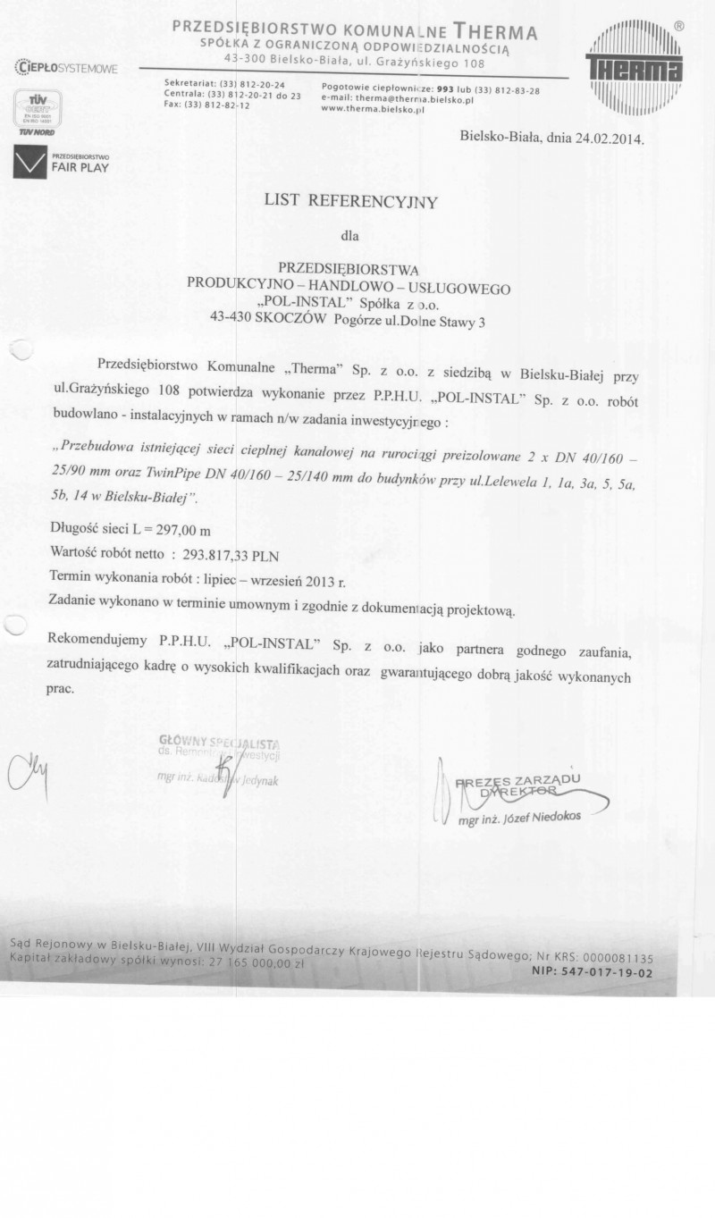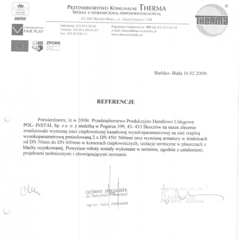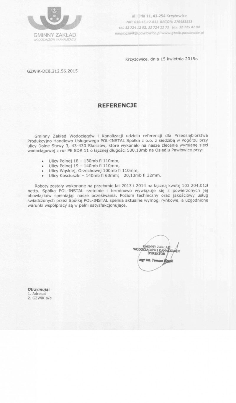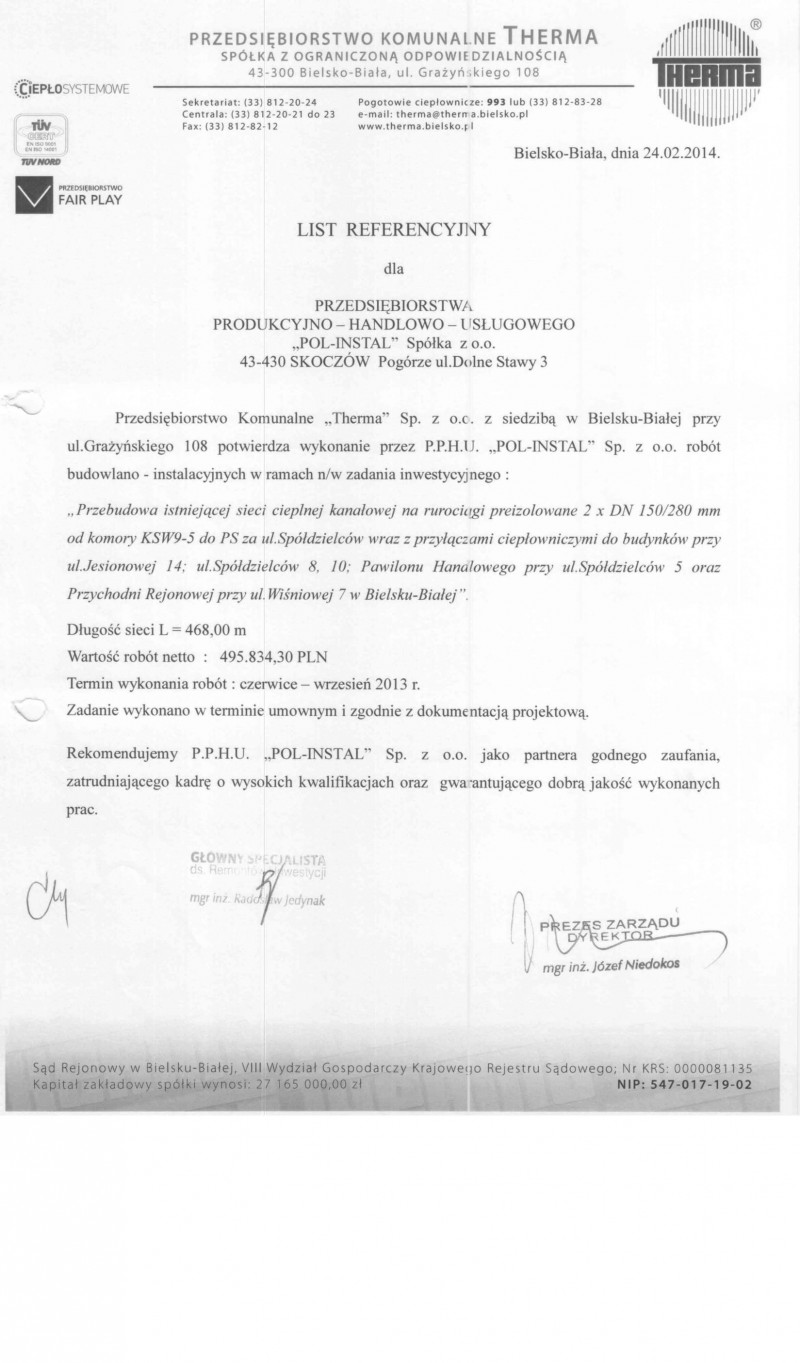 Posiadamy referencje, które obrazują zakres naszej działalności, zarówno w przemyśle, jak i budownictwie użyteczności publicznej, a także w gospodarce komunalnej – sieci ciepłowniczych, gazowych, wodociągowych, kanalizacyjnych.